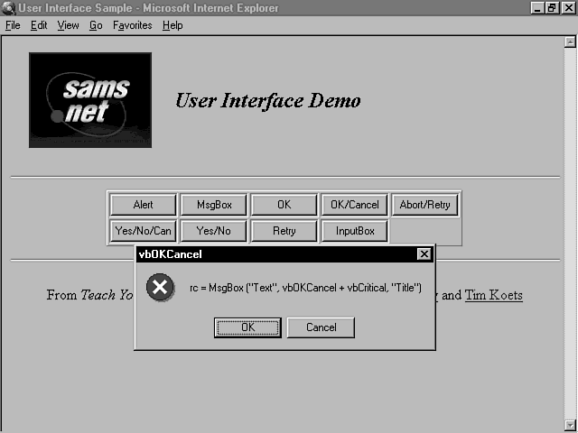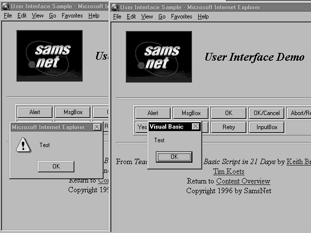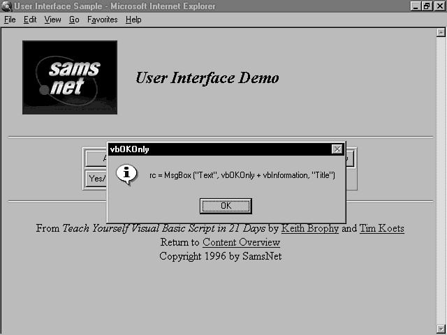 VBScript offers another way to send a message to your user: You can use the Alert function. This function was first used in the JavaScript language. It actually isn't a part of the VBScript language, but is a function supported by the Internet Explorer host environment. Because you have access to host objects from VBScript (covered in more detail on Day 18), you can use Alert. Like MsgBox, Alert displays the text in a message window and provides a button that must be selected to acknowledge the message. The windows generated by Alert and MsgBox are shown in Figure 14.1.