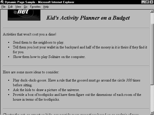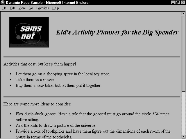 You have a user-customized page! But if this were all that was involved, you might as well have just created two separate pages in the first place. However, assume there is still more information that you want to show on every page, regardless of the user's attitude toward money. An additional list of generic activities is provided in either case, along with a helper button. This common HTML can be generated just once, following the customized section. The portion of the page that generates this generic information is regular HTML (with no script needed) and is shown in Listing 14.8.