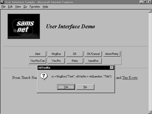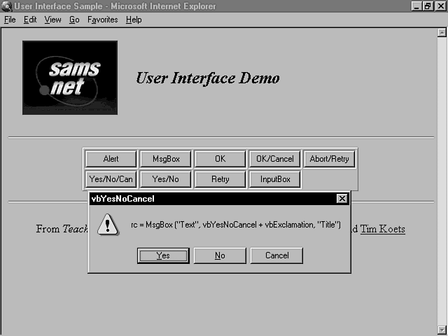 Today's lesson looks at how you can make dynamic documents through intrinsic functions of VBScript and the document object rather than through separate components of the page. The message box function MsgBox provides feedback to the user in a message window. The message remains for the user until it is acknowledged. The Alert function serves the same purpose, but places the title Alert at the top of the window. Parameters of the MsgBox function control the message, title, icon, and buttons displayed. This function can even be used to solicit a response from the user. If more than one button has been requested, the function returns an indication of which button was selected.