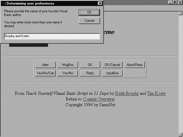The MsgBox function goes a long way toward creating interactive pages without integrating components, but a closely related function goes even further: the InputBox function. The InputBox function works like the message box function in many respects. Parameters control a prompt message and title. In addition, parameters can indicate where the input window should be positioned onscreen. The most important distinguishing characteristic of InputBox, however, is that it uses the prompt message to prompt the user for an input string. That input string is then returned to your script.