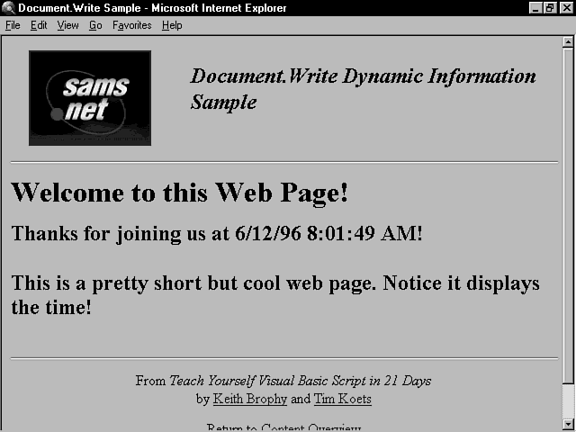 A key goal of VBScript is to enable you to make your documents come alive. With VBScript, your documents are no longer just another pretty document for the user to stare at. Instead, your document becomes an interactive application. It responds to the user's requests, obtains information from the user, and carries out processing at his request. By now you know a lot of what it takes to make a document come alive. You've seen how to put together a script that interacts with component objects on the Web page. Examples of integrating intrinsic controls, ActiveX objects, and Java applets have appeared on previous days, along with techniques for wrapping code around them to let your scripts interact with them. But you haven't yet seen all the details of how to make the page itself be responsive above and beyond the components placed on it.