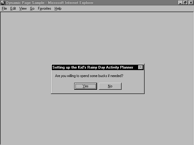For the kid's activity planner example, the first step of customization is to find out if the user wants to spend money on the activities. You use a message box in the script startup code to prompt the user for his response as soon as the page starts to load. This code is shown in Listing 14.7.