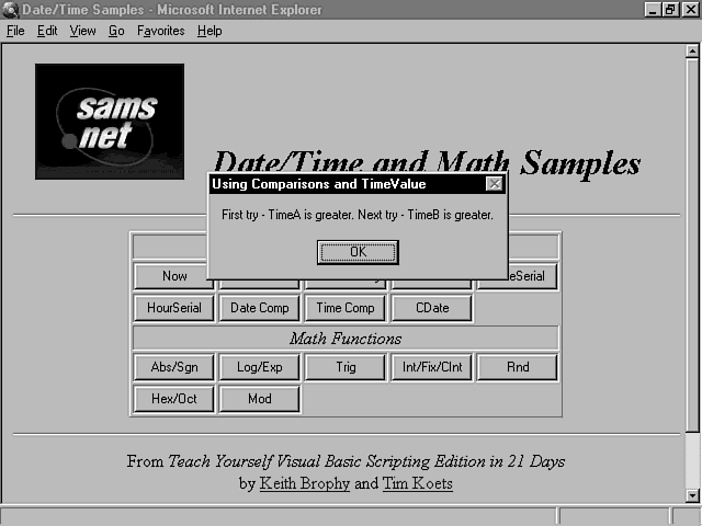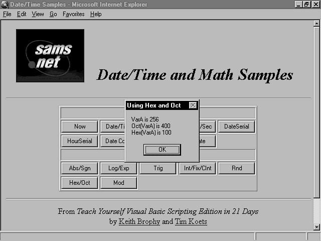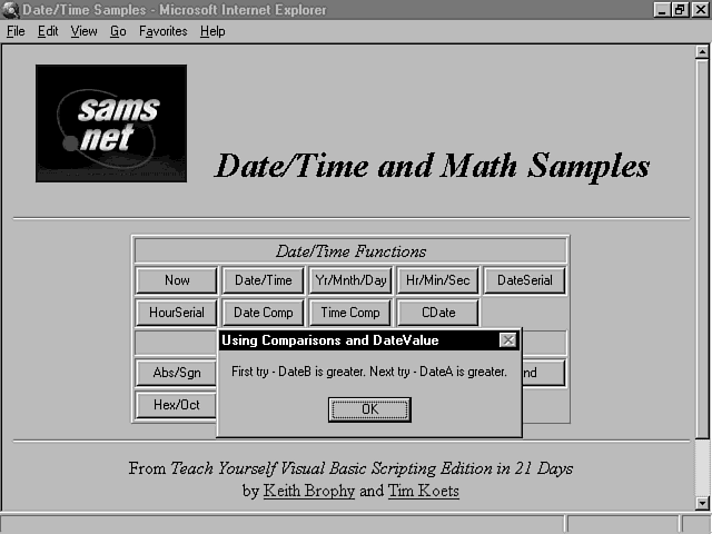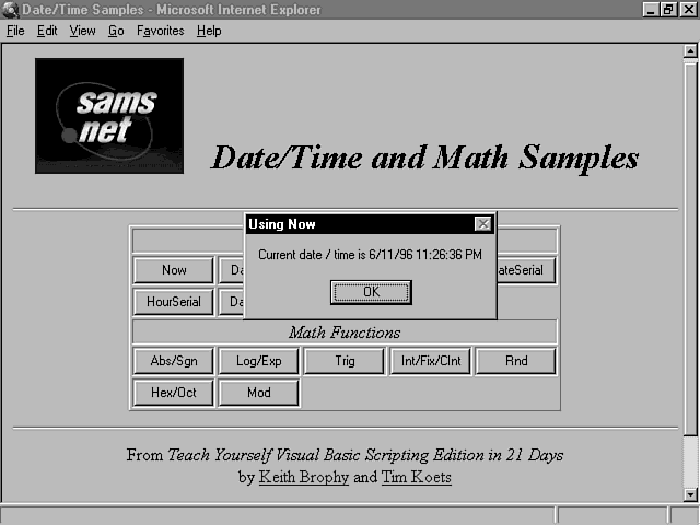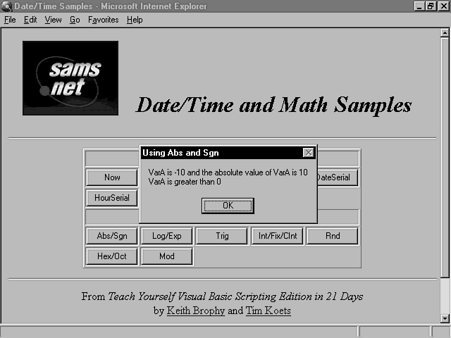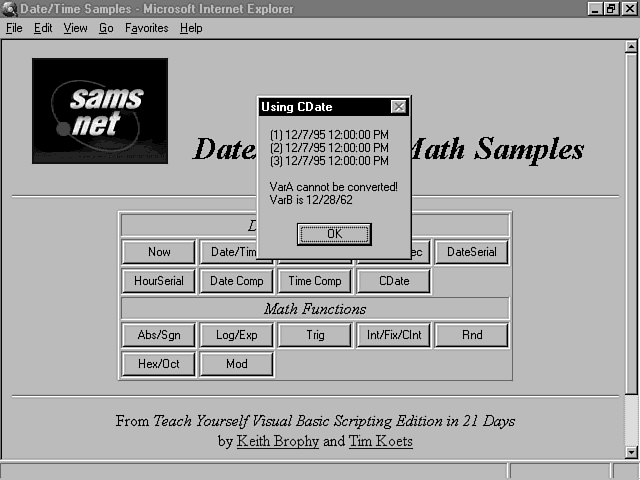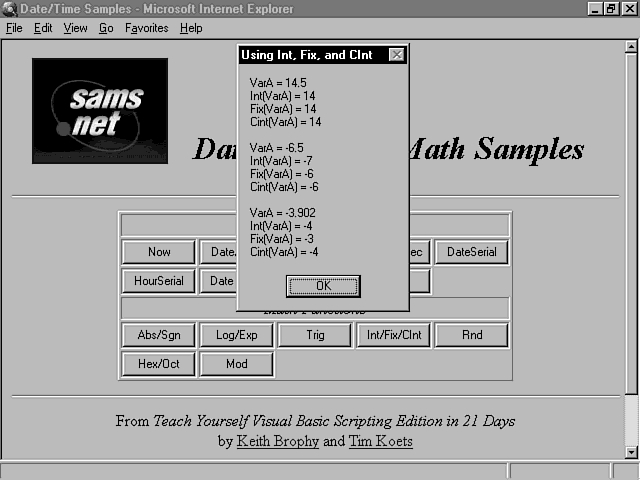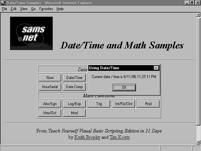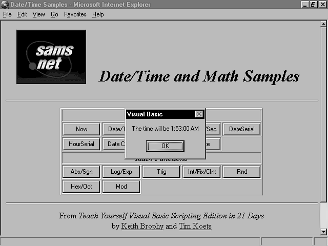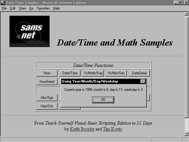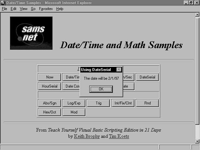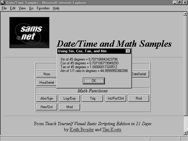 Yesterday you saw how you can extend the capabilities of your Web pages by incorporating the advanced string handling built into VBScript. This is fine if you're parsing standard data, but there will be times when you want your scripts to do more. Perhaps you'll need to work with dates and provide future payment due information to your users. Maybe you'll need to provide a time estimate of when service for a certain type of car repair will be complete. Or maybe you'll need to generate random numbers on the page to implement an online slot machine. Who knows? Depending on what type of programming you are doing, the day might even come when you have to dust off the old trig books to provide an algorithm based on trigonometric principles.