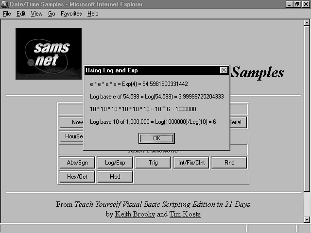 Many math functions can save you a lot of time in math-intensive scripts, just as many date functions are supported in VBScript to make date handling easier. Trigonometric functions allow you to carry out angular geometry calculations in your code. The logarithmic functions Exp and Log allow you to calculate exponents and logarithms based on the natural log base e. Perhaps more useful is the fact that if you know how to use Log, you can apply the formula to determine the logarithm of any number, regardless of base. Supported trig functions are Sin, Cos, Tan, and Atn. Many other commonly used trig values are not directly supported by VBScript, such as the inverse hyperbolic tangent. But by using the functions that are supported as building blocks, any of the more advanced functions can be easily supported directly in code.