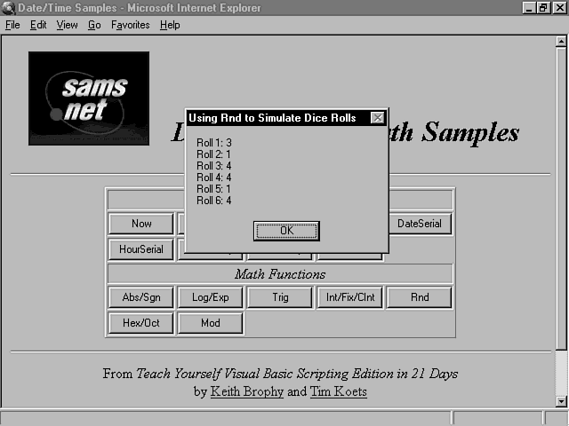 You can see this formula at work in Listing 16.15. This sample program simulates the roll of six dice. The Random statement is used at the beginning of the script to ensure a different series of numbers will be provided each time the script is run. Then each specific role is generated by a call to the Rnd function. The formula listed earlier is used to massage the return value somewhere into the range of 1, 2, 3, 4, 5, or 6.