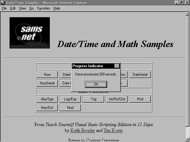 One sample Web page containing a collection of scripts is used to demonstrate all the functions in today's lesson. This page, AllFunc.htm, is available on the CD-ROM. The sample scripts referred to throughout the lesson can be found there. A separate command button is used to launch individual tests that focus on specific functions and display test results in a message box. |