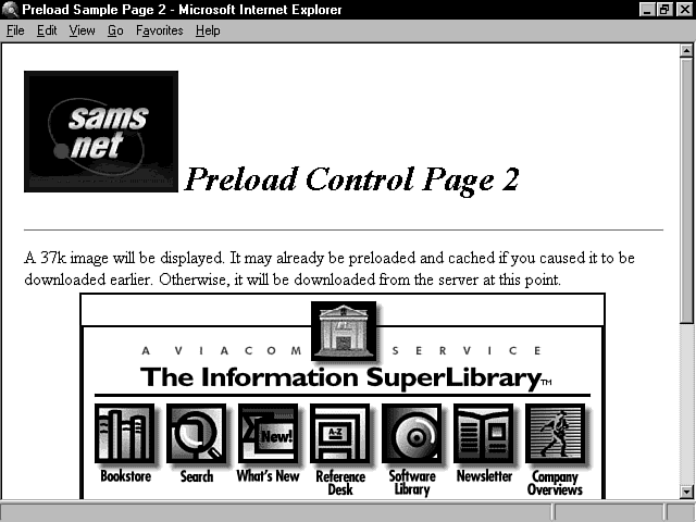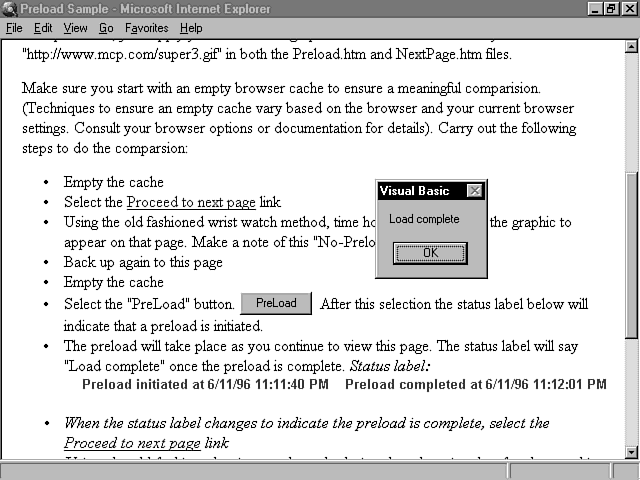Instructions for carrying out the comparison of preload and no preload appear on the page displayed by preload.htm. Study the script events from the preload.htm listing in Listing 18.10 before viewing the page. Then, when you view the page, see if you can mentally match up the page feedback to the events you examined.