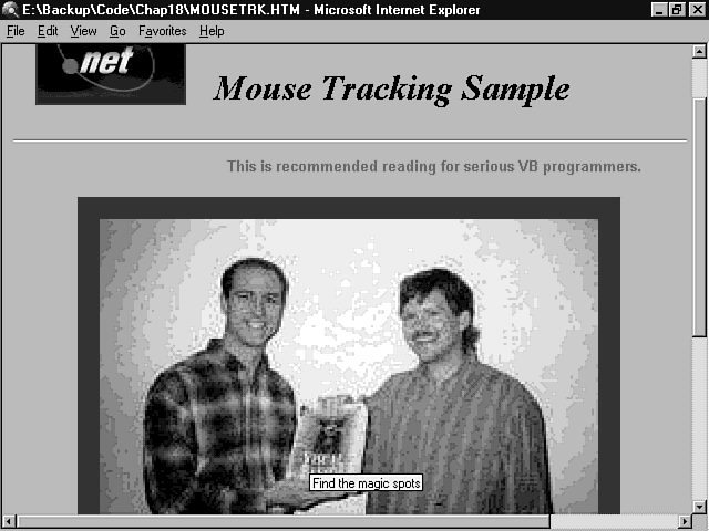 Another aspect of pages that you can easily control through VBScript is the anchor. The anchor defined through HTML can be specified with an ID attribute. This name is then used in VBScript to refer to events of the anchor. The MouseMove event occurs whenever the mouse moves over the anchored image or text. The MouseMove event is accompanied by parameters that provide the current x,y location of the mouse. These parameters can be used directly or stored for later reference by the Click event. The Click event occurs whenever the anchor is clicked on. The Click event is not provided with any parameter information. Click event code that needs to make decisions based on the current mouse position can do so by looking at the mouse position last stored by the MouseMove event.