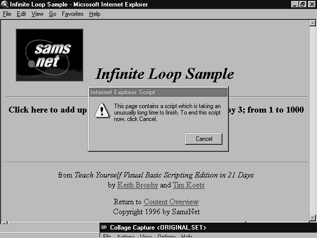 The credit really should go to the browser, however. The message is generated by the Internet Explorer browser when it detects a long period of inactivity in the script. This is a natural safeguard that's built in to the browser's support of the script language. Its purpose is to keep any page's script from locking up the browser with infinite processing.