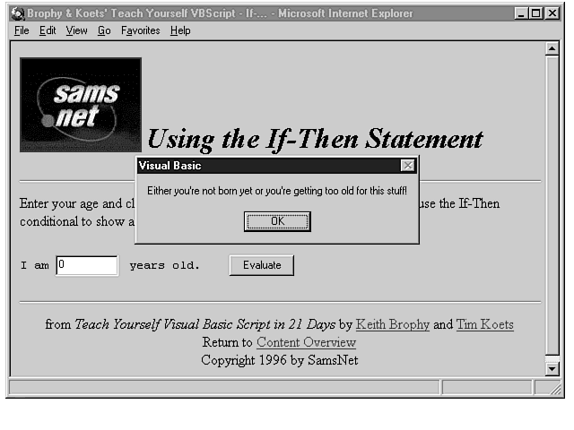 Listing 6.1 shows a working example of VBScript code that uses the If Then conditional. This Web page, named ifthen.htm, is also on the CD-ROM that accompanies the book.