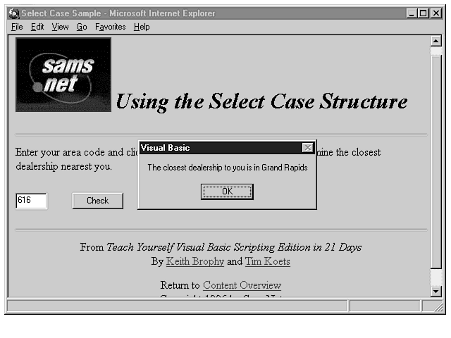 Notice that the condition takes advantage of the logical Or operator that you learned about on Day 5, "Putting Operators to Work in VBScript." If you don't remember how the Or operator works, you might want to take a look back at Day 5 to refresh your memory.