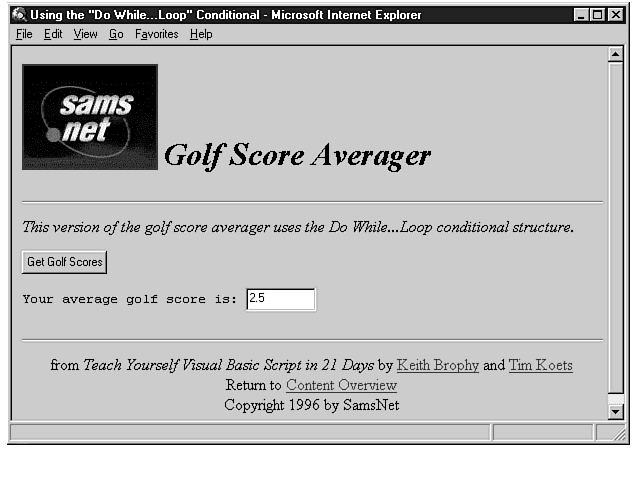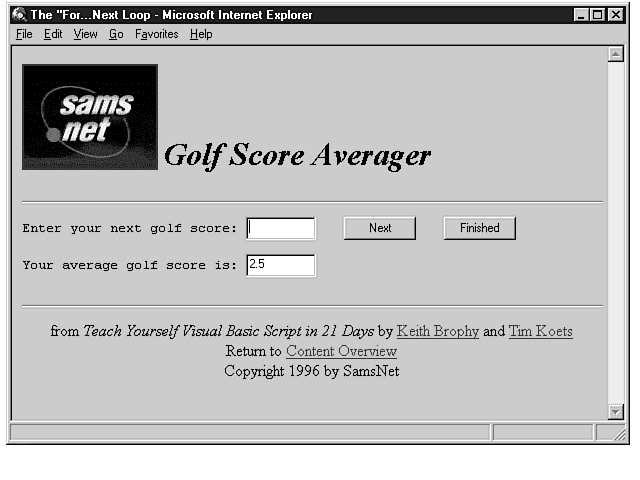 You can see an example of the Do While Loop in action in a slightly revised golf average example. Here, the user once again enters golf scores to average them, but this time, things are handled a bit differently. Figure 6.5 shows the Web page, which is stored as golfdwlp.htm.