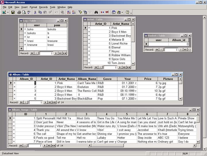 Базата данни (ourdb.mdb) е реализирана на MSAccess 2000 и включва 5 таблици: