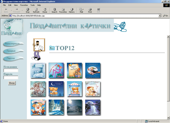 В проектa, страници от който са обект на вниманието ни и който можете да разгледате само тук, е разработен сайт описващ една интересна услуга - изпращане на поздравителни картички по Интернет. В реализация е обърнато внимание на един нов подход в областа на Web интерфейс към бази данни, а именно обектно-ориентиран подход за достъп до бази данни (чрез Java) плюс допълнителни възможности за работа с HTML форми.